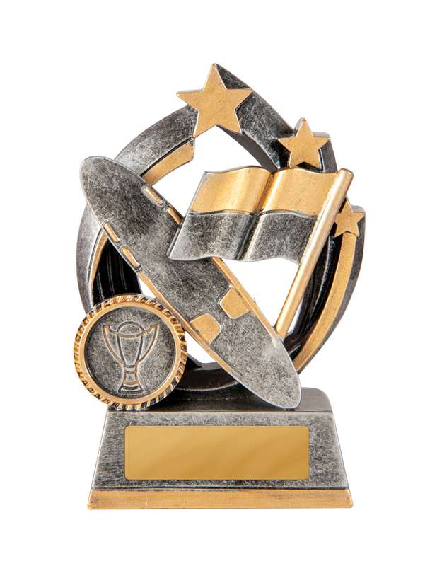 Visually unique series of trophies that feature 3D front for your sport or activity – space for logo & finished in classic antique silver.
