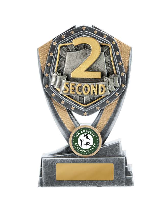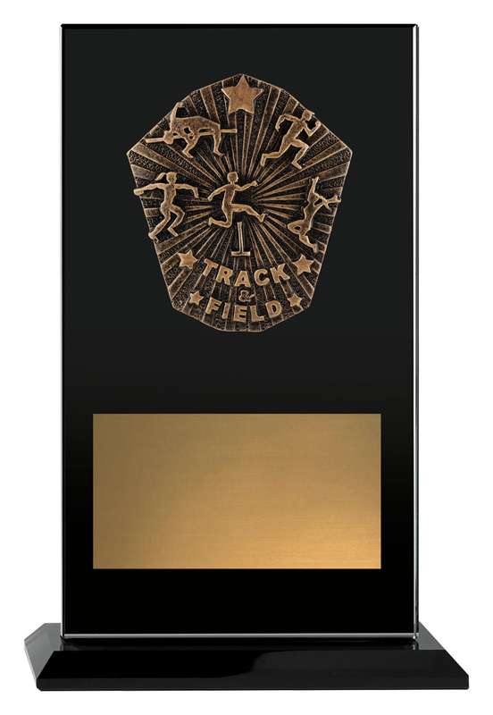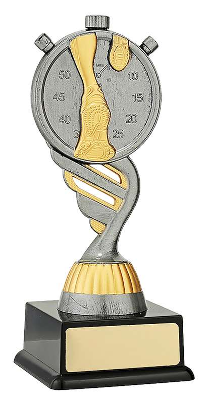 Brilliant athletics trophy with running shoe and stop-watch suits various track events. The Gambit offers a dynamic theme in antique silver & gold – space for your custom logo.