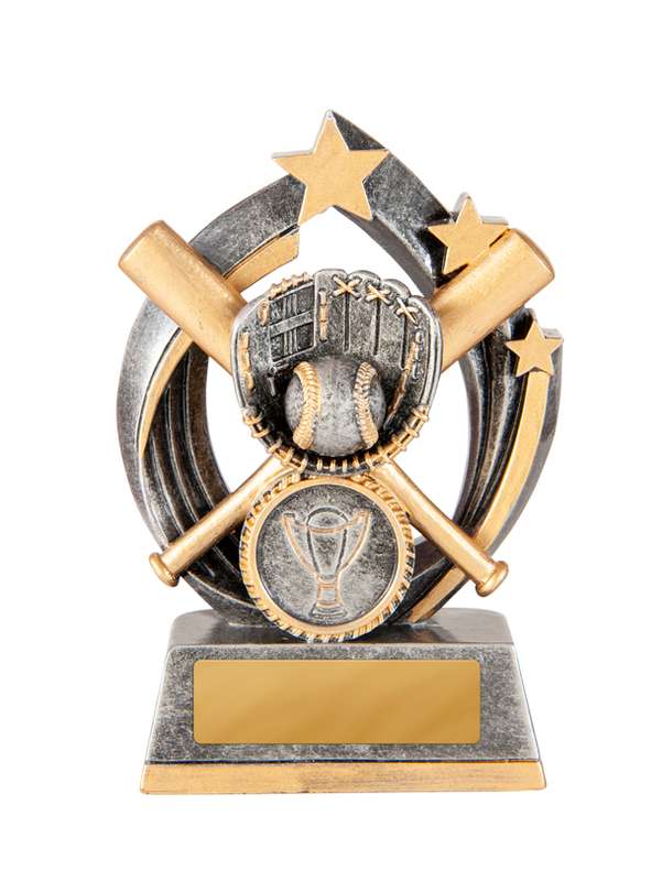 The Panorama series of baseball trophies are presented in classic gold colours and feature an attractive design of diamond, ball and bat. Available in 2 sizes and with space for 25mm insert if required.