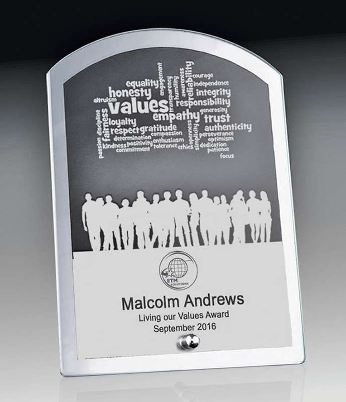 Bold glass awards feature distinct black colour with silver reflective border. Arrow shape presents a unique design for your budget glass awards. Space for your logo.