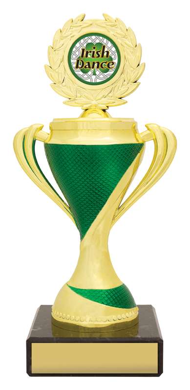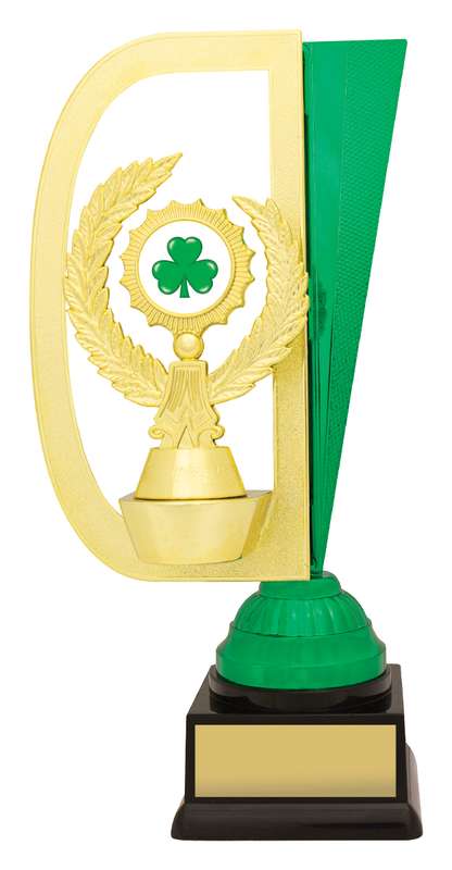 Cobra Cups feature innovative green & gold colour combination for your Irish themed trophy. Go with the activity sticker shown or ask about a custom logo.