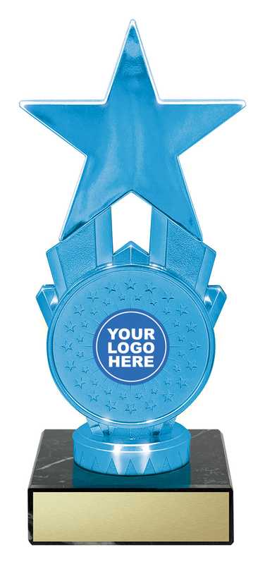 Cosmic series of affordable trophies feature star spangled holder in gold or silver – choose colour of column to suit your order. Suit 25 or 50mm centre insert.