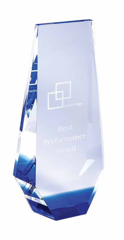 Sophisticated range of crystal awards with striking blue panelling effect that allows for precision engraving to elevate your awards.