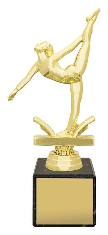 The Female Gymnast finished in bright gold, depicts a participant in an iconic movement and pose. Traditional multi-part trophies popular for the sport of gymnastics. Female and Male top counterparts available.