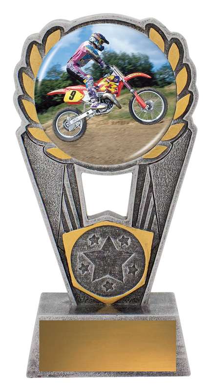 Dynamic motorcross trophies well suited to range of events. These ‘Flag’ bike trophies feature a stylish star based design with a rider in action.
