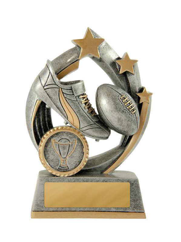 Dynamic footy trophies perfect for male and female players in your club. These ‘Flag’ aussie rules trophies feature a stylish star based design with iconic boot and ball elements.