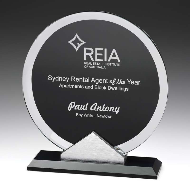 Affordable and stylish glass awards feature a bold design that may be well suited to your event or presentation. Supplied in gift box.