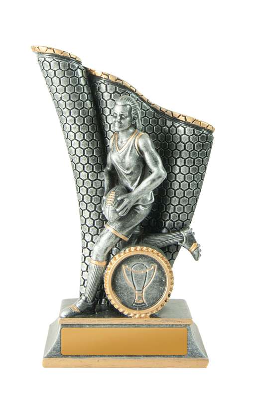 Brilliant footy trophy for your team or club. The Gambit offers a dynamic theme in antique silver & gold – space for your custom logo.