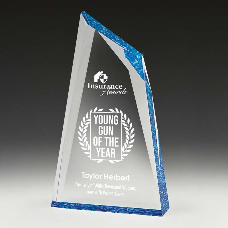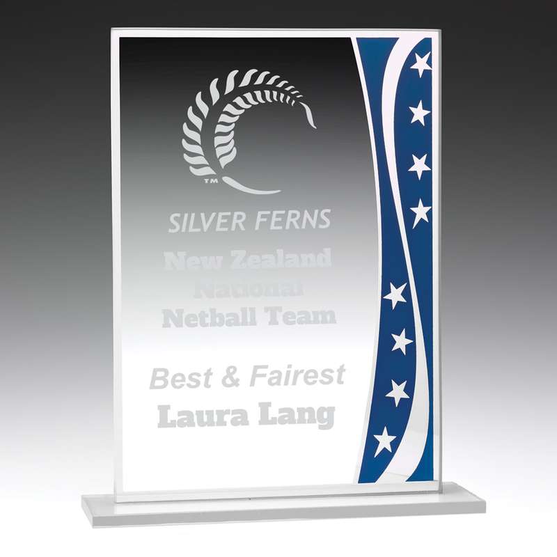Series of glass towers in 3 sizes ideal for a prestige award. Use series with adaptable tops to suit your order. Quality glass highlighted with vibrant blue trim.