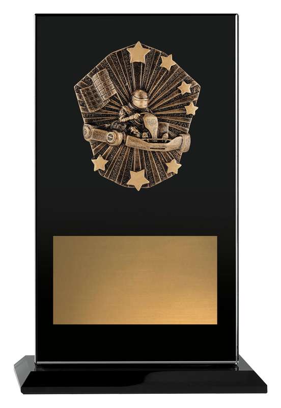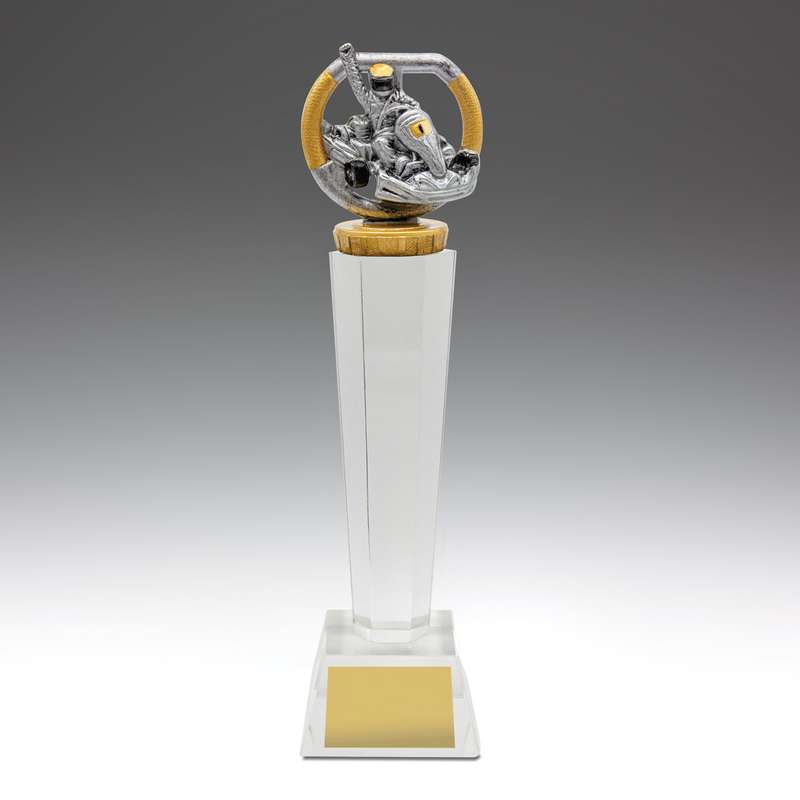 Range of FastFix trophy parts allow for easy to use and affordable trophies. Go Kart top features a classic scene of a victorious driver.