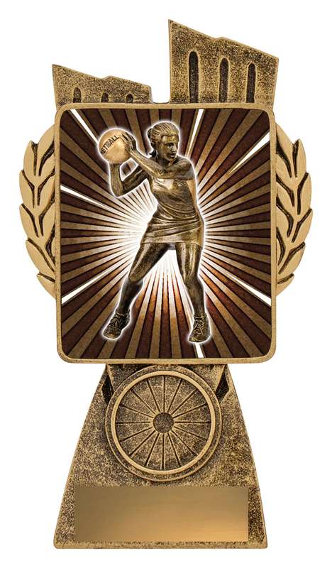 Elegant design of participation trophies for Netball feature iconic ball & net elements and finished in classic antique silver.