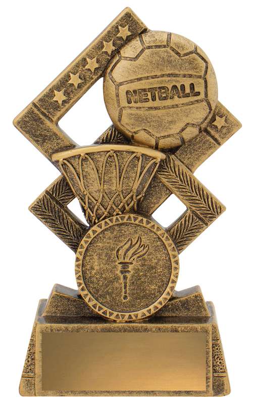 Brilliant Pulse series of netball trophies showcase superbly detailed ball & net against striking star background – affordable trophies for your team or club.