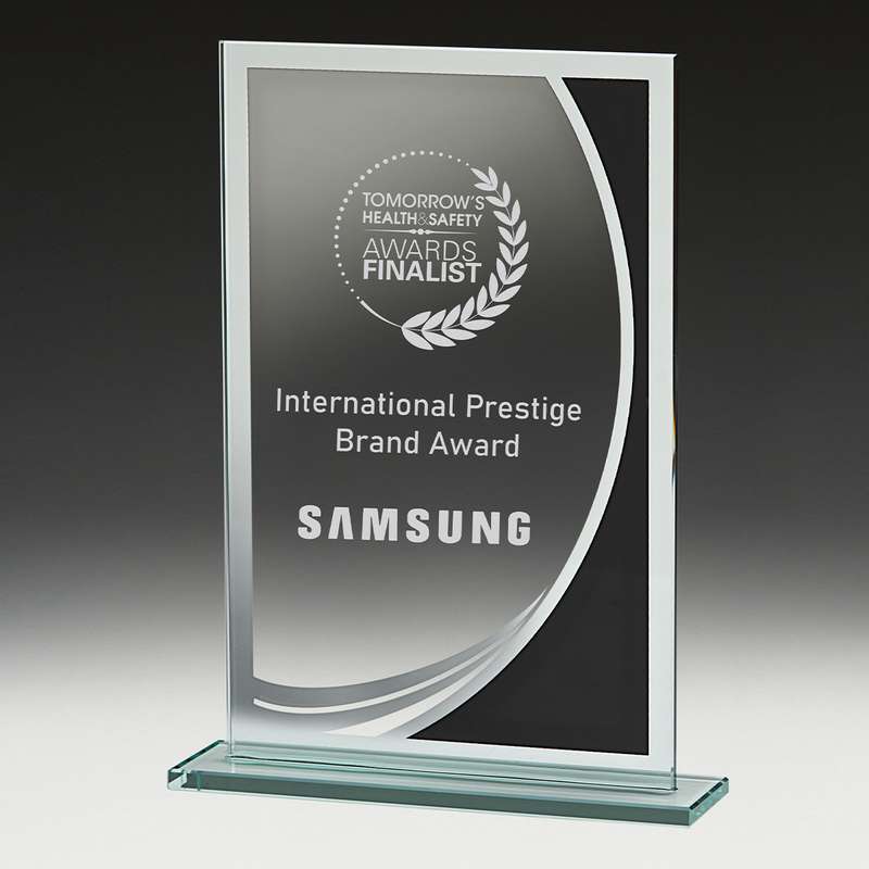 The Pacific design offers a budget glass trophy which features a brilliant shiny blue glass offset to make this award standout.