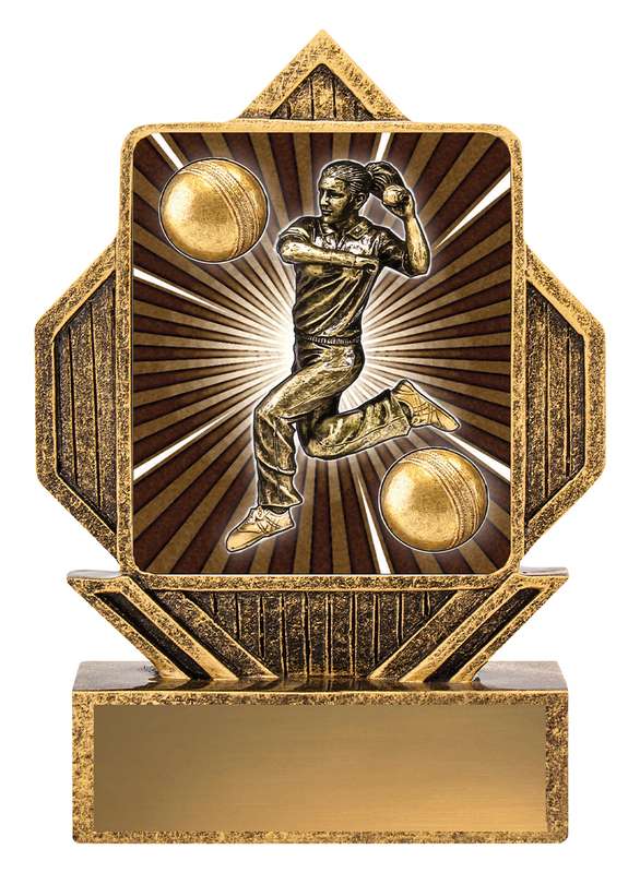 The Peak Series – for Cricket – is an innovative trophy series offering super value for such an impressive size range. An elevated design that showcases a male bowler theme against a vibrant sunray style background.