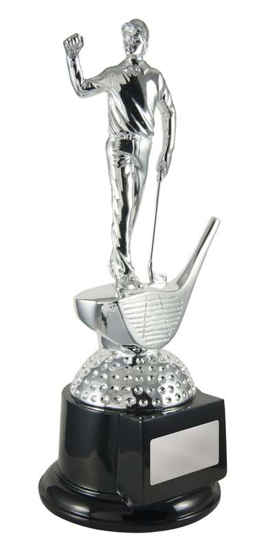 Classic golf trophy series available in 3 substantial sizes. Design features all the details and the traditional golfer at the completion of his drive. Finished in classic antique silver.
