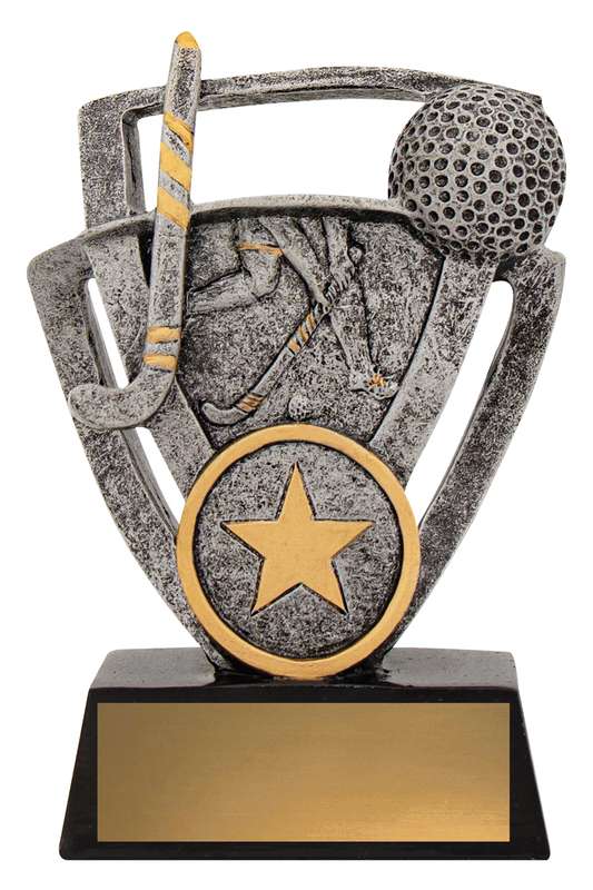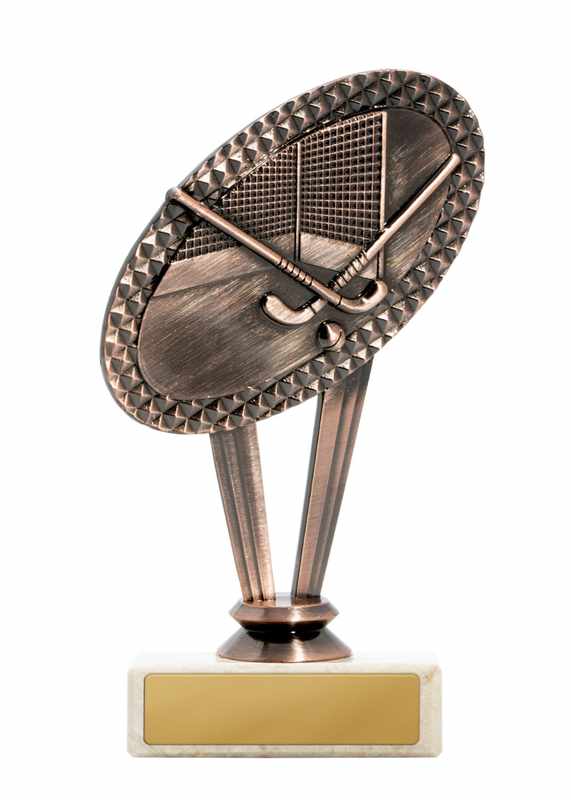 Traditional hockey trophy with iconic crossed stick theme and finished in antique silver. Space for your custom logo.