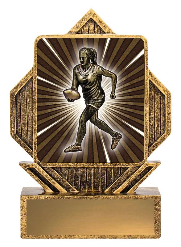 Exciting design of acrylic trophy showcases the gold theme for your sport or trophy. An affordable award with terrific space for your engraving.
