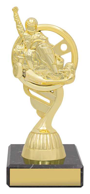 Exciting design of acrylic trophy showcases the gold theme for your sport or trophy. An affordable award with terrific space for your engraving.