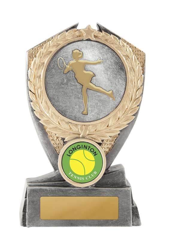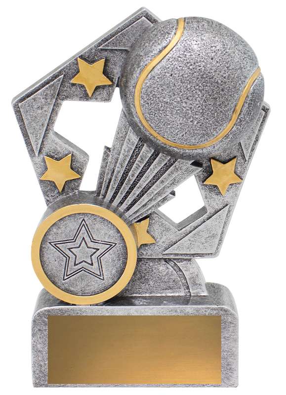 Exciting design of acrylic trophy showcases the gold theme for your sport or trophy. An affordable award with terrific space for your engraving.