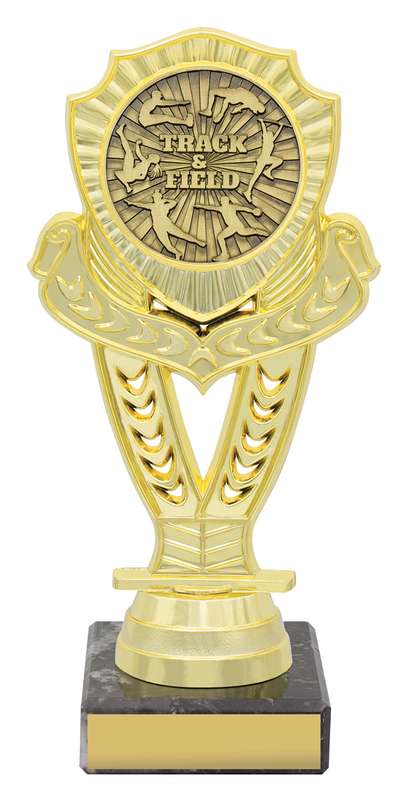Exciting design of acrylic trophy showcases the gold theme for your sport or trophy. An affordable award with terrific space for your engraving.