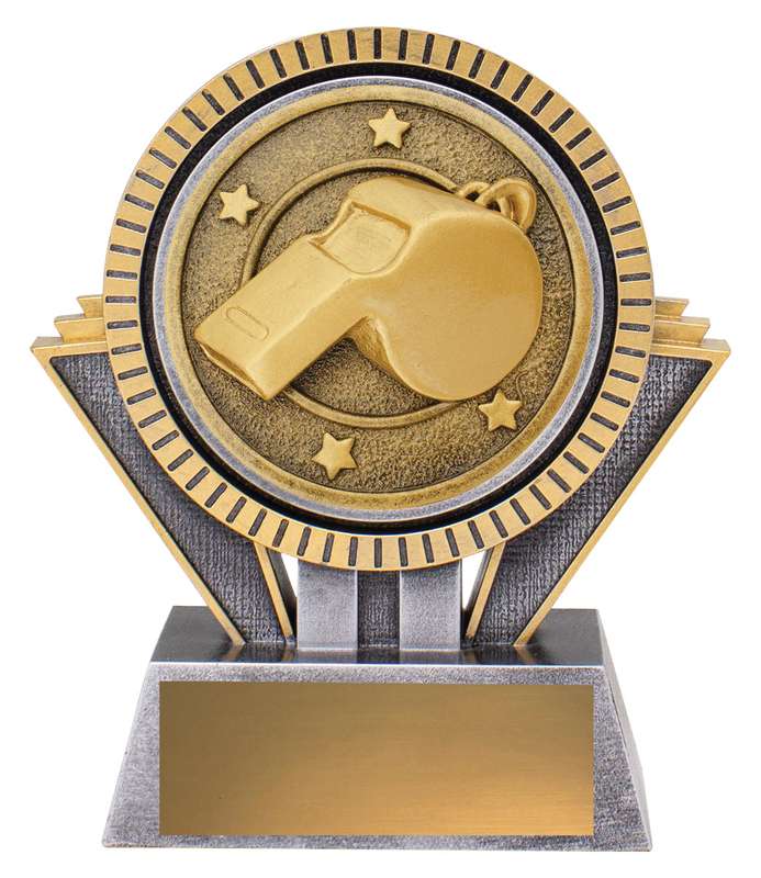 Exciting design of acrylic trophy showcases the gold theme for your sport or trophy. An affordable award with terrific space for your engraving.