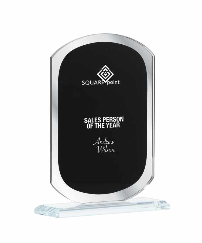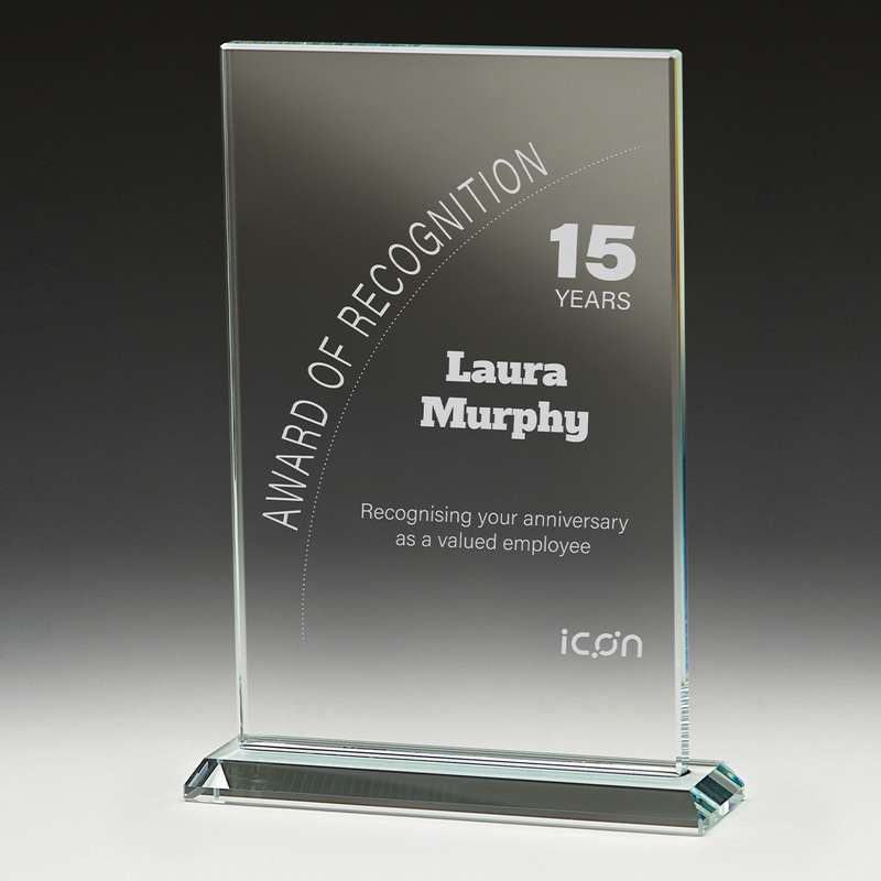 Standout glass award that still suits your budget needs. Clear glass trophy with bright blue accents and central space for your logo.
