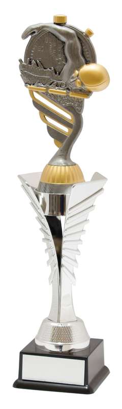 Different tops and figures to suit your design requirements for various Swimming awards. The gold star inspired theme features prominent swim elements – googles and stop-watch against a stylish wreath background. Wide range of bases and riser components to choose from to build your multi-part trophy.