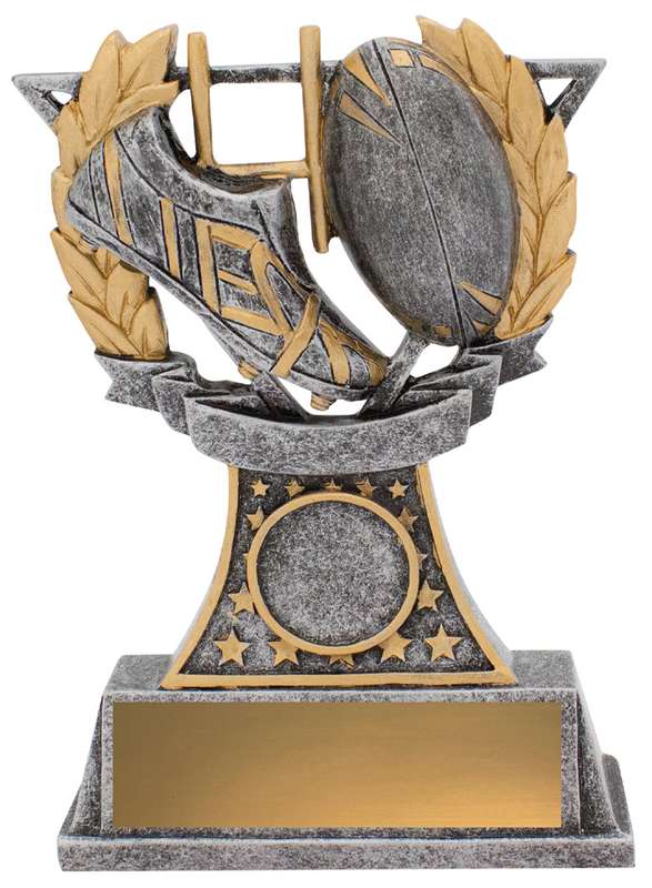 Zoom Series showcases Rugby League or Union player in action against a stylised backdrop and finished in classic antique silver. Available in multiple sizes and includes space for custom logo.